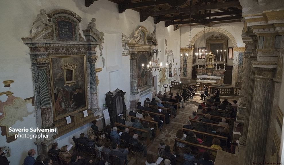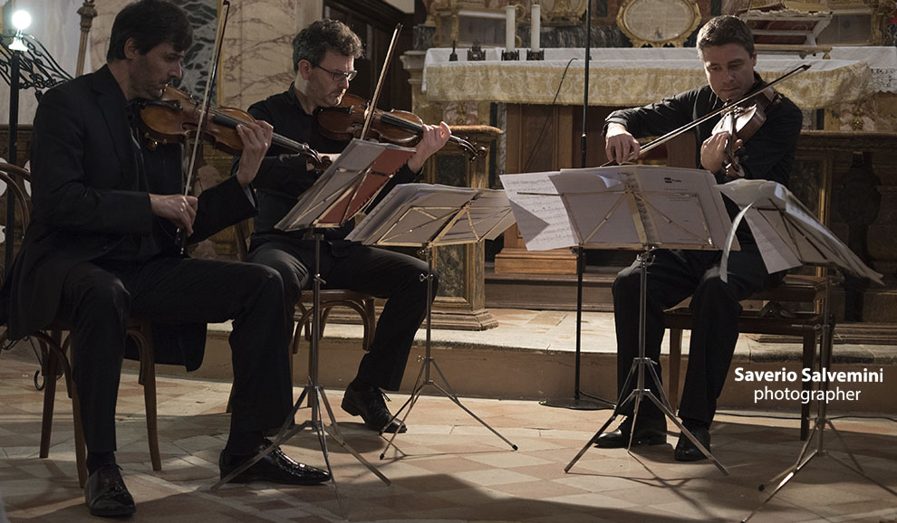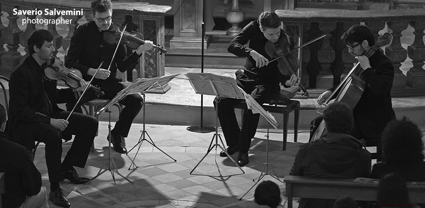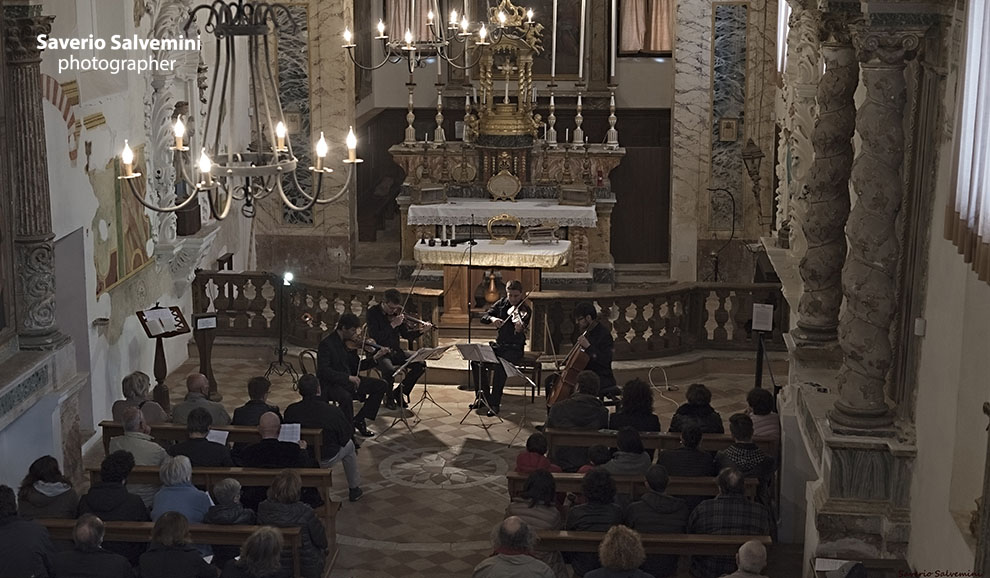 Il Quartetto Prometeo ha tenuto per gli Amici della Musica due concerti, il primo al Teatro Sperimentale, il 22 aprile 2016, come concerto conclusivo della Stagione 2015/2016, l’altro, cui si riferiscono queste immagini, nella cornice della bella chiesa del SS. Sacramento di Polverigi, il 24 aprile 2016. In programma, accanto al celebre Quartetto in mi minore di Verdi e al Quartetto n. 2 di Szymanowski, alcuni estratti dal Progetto Arcana, che il Prometeo sta portando avanti ormai da diversi anni e che accosta compositori antichi e contemporanei. Questi ultimi infatti trascrivono per quartetto d’archi brani dei compositori del passato, sottolineando come la musica antica abbia ancora molto da dire al pubblico di oggi.